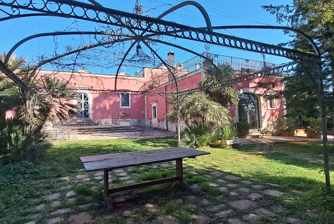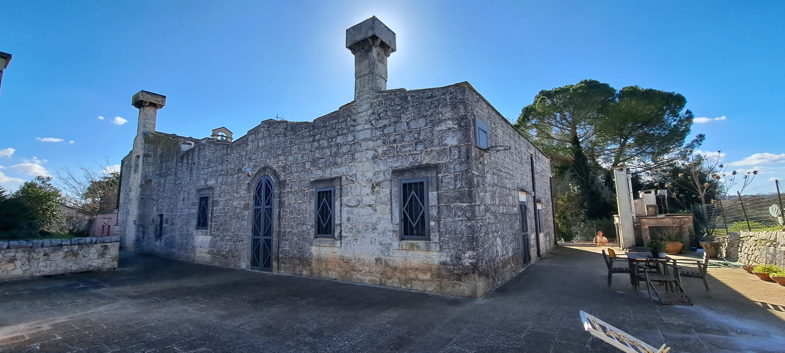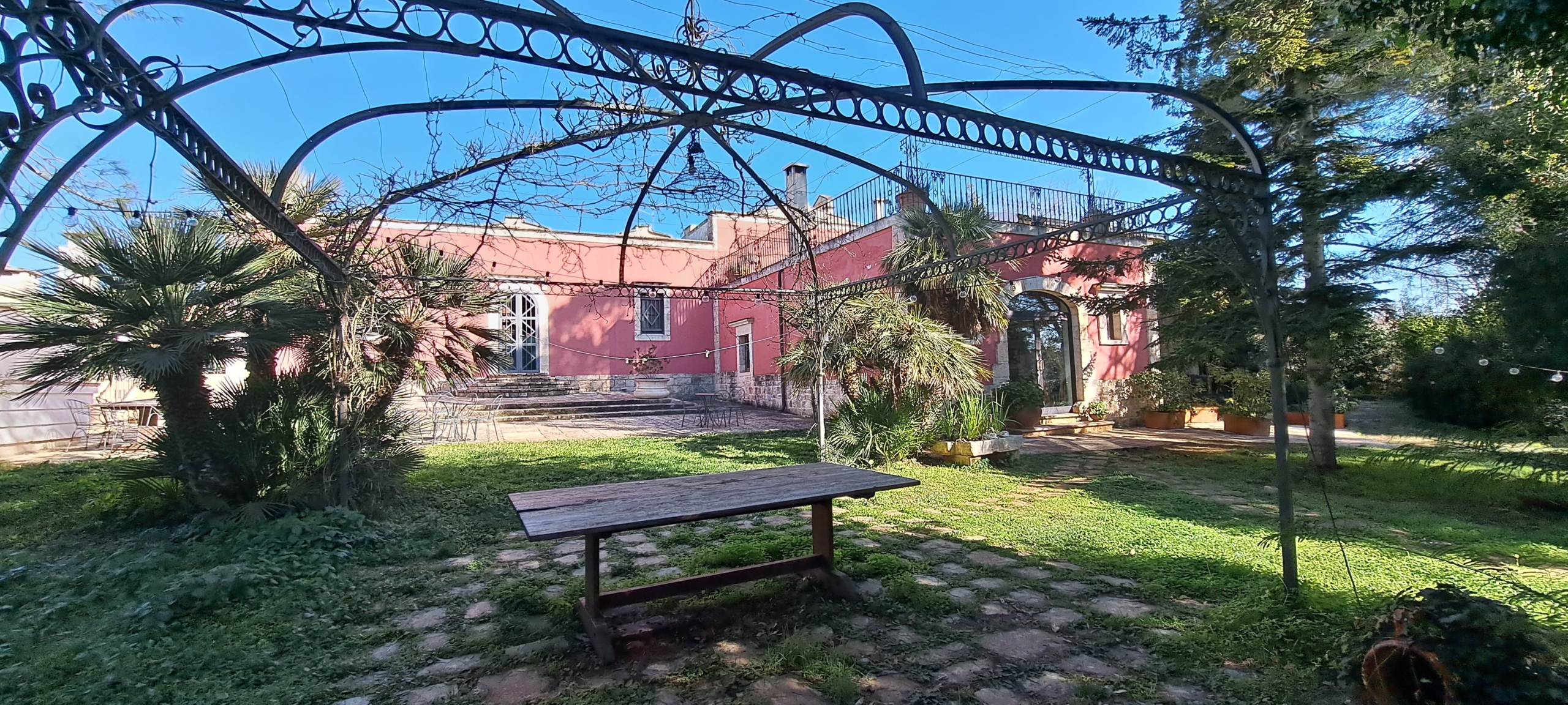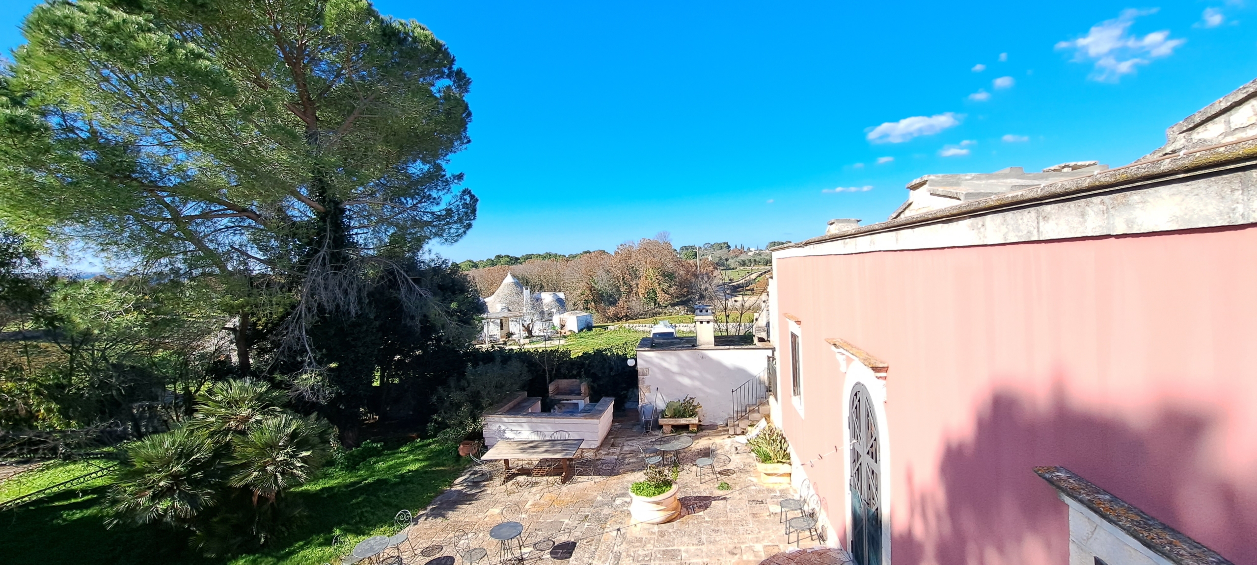 Un meraviglioso parco privato di circa 3.000 mq delimitato da alti muretti a secco separa e circoscrive la parte abitativa dal resto dei terreni. Il giardino è corredato da divani in muratura, gazebo/padiglioni in ferro battuto, corti private ed una splendida aia con pavimentazione in chianche antiche (recentemente restaurata).