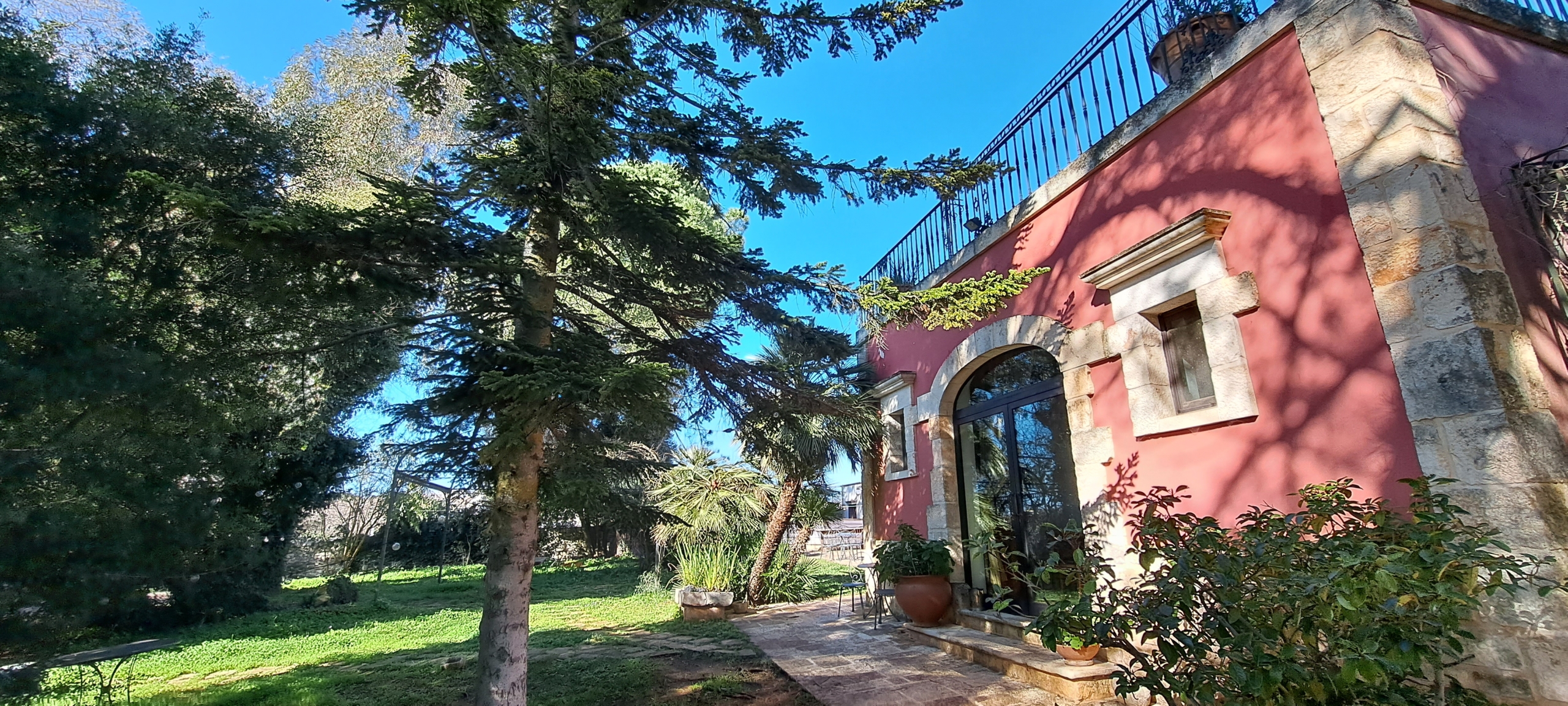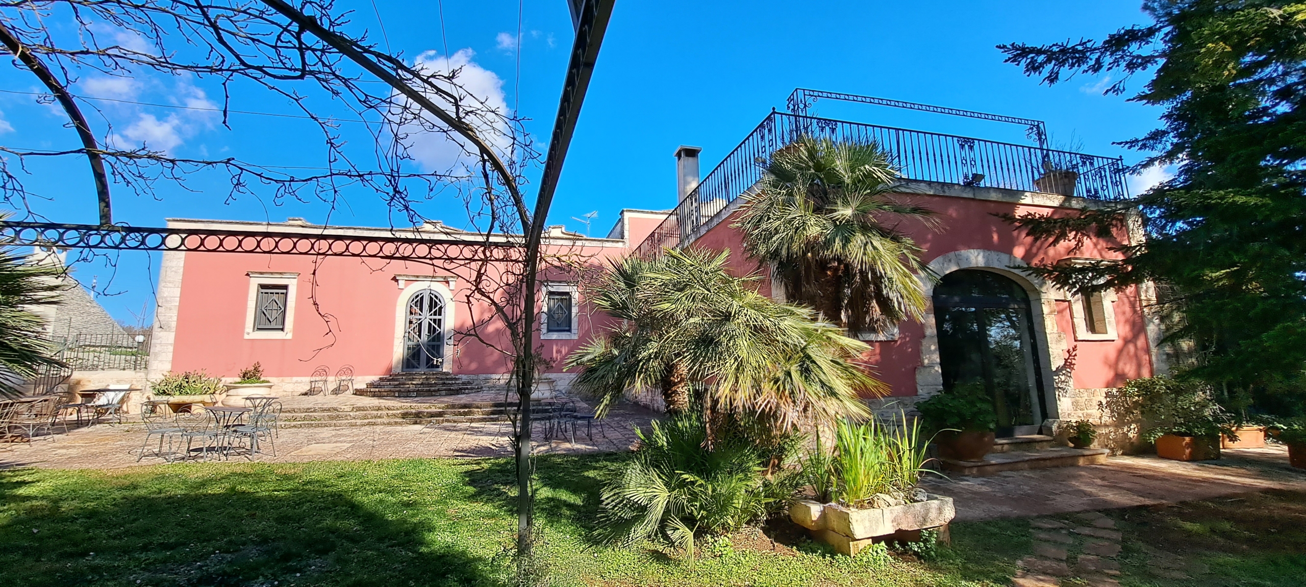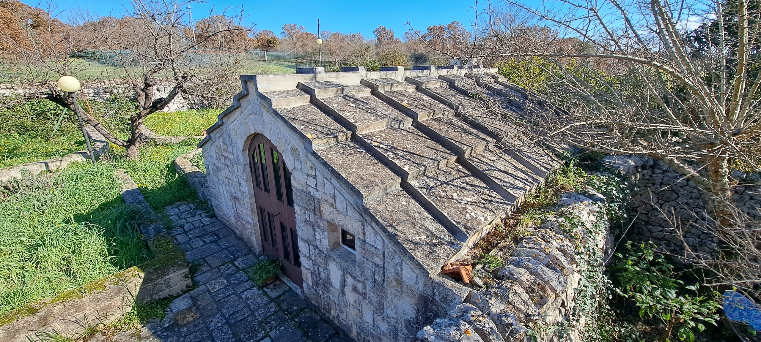 Un meraviglioso parco privato di circa 3.000 mq delimitato da alti muretti a secco separa e circoscrive la parte abitativa dal resto dei terreni. Il giardino è corredato da divani in muratura, gazebo/padiglioni in ferro battuto, corti private ed una splendida aia con pavimentazione in chianche antiche (recentemente restaurata).