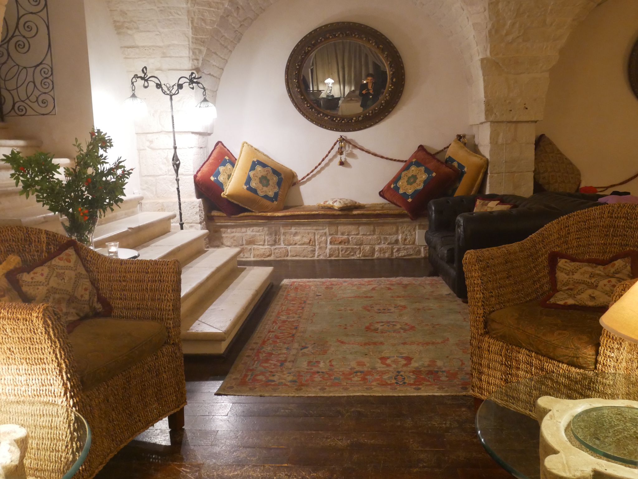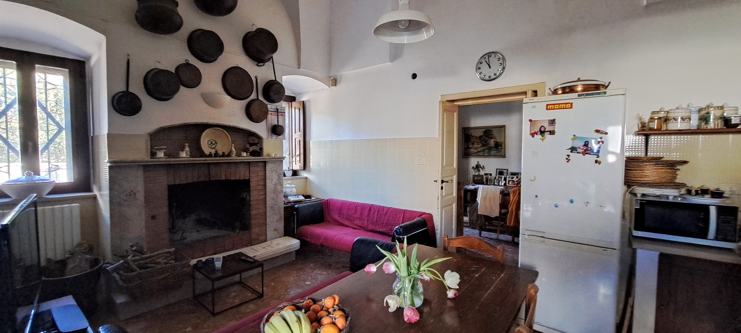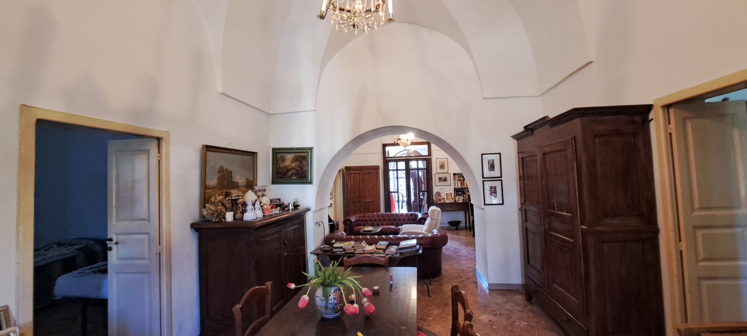 Gli interni si presentano con meravigliosi soffitti alti circa 7 mt voltati a stella e a botte, la pavimentazione è in lastre di pietra originali (”chianche”) e sono presenti numerosi camini restaurati con ricercati elementi di pregio.